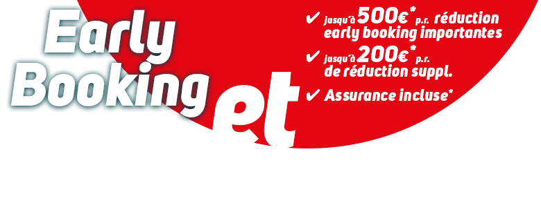 Ne manquez pas cette opportunité ! Réservez maintenant et profitez de réductions exclusives sur votre séjour. Jusqu’à 500 € de réduction Early Booking par réservation ! Et en ce moment, vous bénéficiez d’une réduction supplémentaire allant jusqu’à 200 €*! En réservant tôt, vous avez également le premier choix. Alors n’attendez pas trop longtemps.